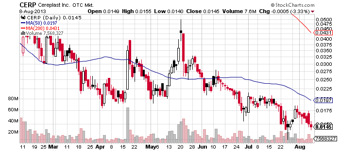 In other words, CERP finished the last trading session 3% lower at $0.0145 per share on below average volume of 7.5 million. The disappointing performance of CERP happened despite the fact that the stock was featured in a promotional campaign, which was initiated by Penny Stock Crowd and Stock Blaster for a compensation of $2,500 provided by EAG Group.