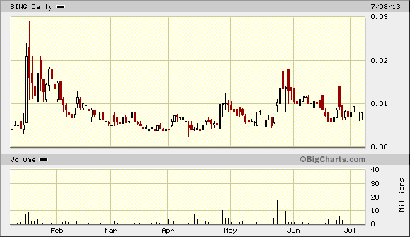 SING went down 1.25% to $0.0079 per share on the last trading session after more than 950 thousand shares of the company’s common stock changed hands. The stock is currently sliding near its 52-week low and it has maintained a trading range within 0.01 and 0.03 for about a year now.