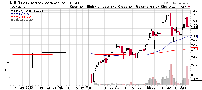 Northumberland Resources, Inc. (NHUR) – After NHUR went through a disastrous promotional campaign last week, in which the company’s stock lost nearly 20% of its value on a volume five times higher than the average, it seems that today third parties are much more determined to pump the stock.