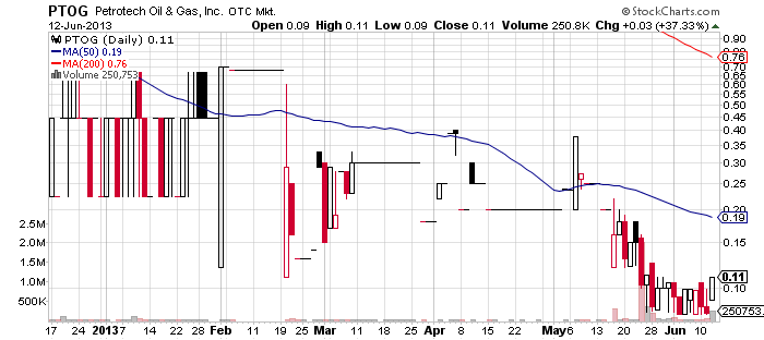 Yesterday, PTOG soared 37% to $0.11 per share on above average volume of 250 thousand. This set the company’s market cap at $3.9 million. Today, penny stock traders will see whether PTOG will continue the up move and bounce from the all time low or suffer another failed promotion and fall further down the chart. Truth be told, it will not be surprising if investors react reservedly to the pumping efforts on a stock which had already burnt them severely in the past.