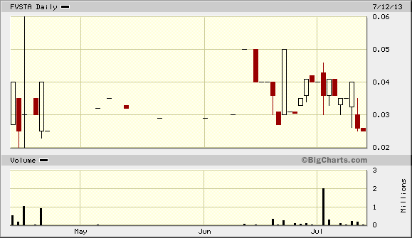 Seasoned penny stock traders will find it interesting to know that the previous campaign on FVSTA took place on Jul 2nd and was led by The Stock Mister who had been compensated $14,000 by a third party called Red Tie Financial for a one-day marketing program regarding FVSTA.