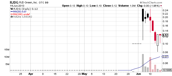 RJD Green Inc. (RJDG) – After crashing down from $0.24 to $0.08 during a period of heavy promotions, which we already branded as a sheer “pump-and dump” scheme, market players might have thought that the game has ended and third parties and speculators have milked all the profits they could form the stock. Alas, it seems that there is still more cash in the cow called RJDG stock as the pumping efforts have been renewed and been set to full steam this weekend.
