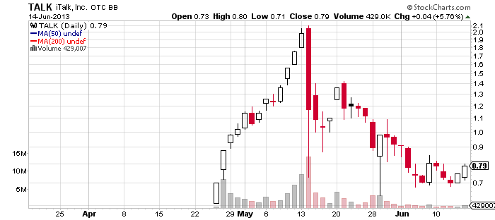 iTalk Inc. (TALK) – TALK stock, which must have caused a lot of heart attacks among common stock traders after the artificially inflated stock burst into pieces in mid-May, is once again on the spotlight of the micro cap market as a new wave of promoting letters hit investors’ inboxes this weekend.