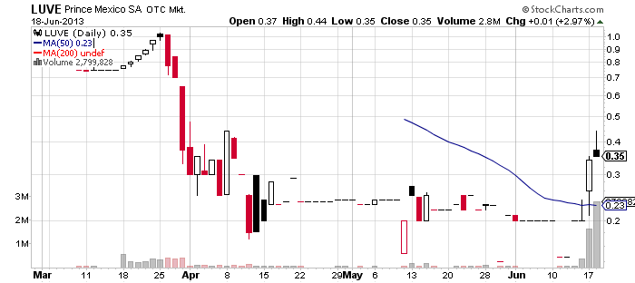 Prince Mexico S.A, Inc. (LUVE) – The pump of LUVE stock continues at full speed today. In fact LUVE is the most heavily promoted stock this week as the cost of its campaign has already exceeded $400,000.