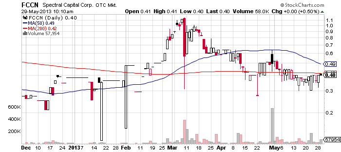FCCN stock has been struggling with a stubborn resistance at $0.40 for the last couple of weeks, which remained intact even after the promotion. In addition FCCN has been in a downtrend since mid-March and is currently positioned under the 50-MA.