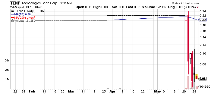 Technologies Scan Corp. (TENP) – TENP is also among the promoted companies today. What is notable about TENP is that it started trading only one week ago and it made its trading debut with a dramatic plunge that wiped almost 60% of its stock value in a single day.
