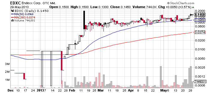 On Friday last week EDXC generated a trading volume of more than 2.4 million shares while the price of its shares jumped 20% to $0.13 per share. Yesterady EXDC closed at $0.145 per share. EXDC stock may experience another round of buying pressure today thanks to the widespread advertising campaign, unless third parties plan to dump their shares on the hype and thus tip the scales towards sellers.