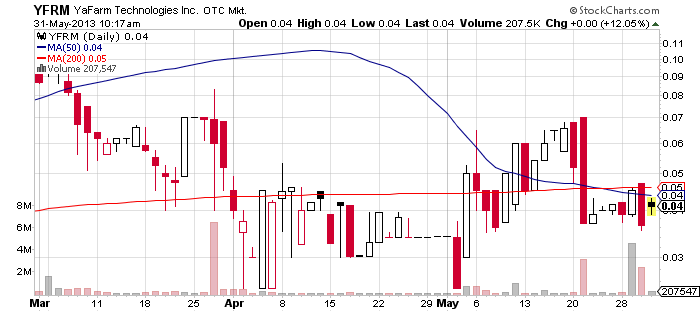 YaFarm Technologies, Inc. (YFRM) – Yesterday YFRM fell down 18% to $0.0365 per share on a volume eight time higher than the 3-month average. With this big plunge YFRM completely wiped out the gains which investors made on the stock the previous day.