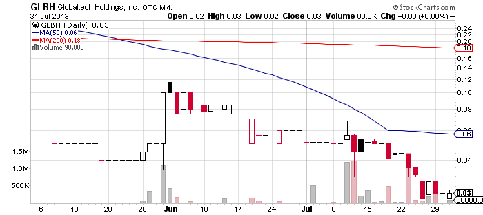 The last promotion of GLBH took place on July 10 and at that time GLBH rose 12% to $0.056 per share on a volume of 1.2 million. However, shortly after the promotion the stock got pummeled and at the moment its value is two times lower at $0.0255.