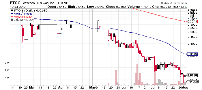 Petrotech Oil & Gas, Inc. (PTOG) – Penny stock promoters have also been touting PTOG since the last closing bell. The campaign is led by an undisclosed third party which had provided $5,500 for the advertising effort on PTOG.