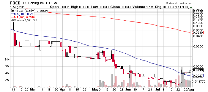 FBCD has demonstrated a momentum for the last two weeks rising from $0.0015 to $0.0039 on a heavy trading volume. Yesterday, FBCD climbed 11% to $0.0039 per share on a higher than average volume of 1.5 million.