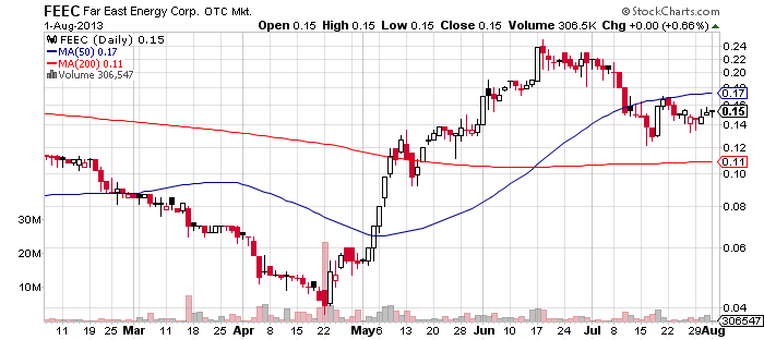 On the last trading session, FEEC closed 1% higher at $0.153 per share on a lower than average volume of 300 thousand. The stock has been slowly losing ground in the last couple of days as it has not received any fundamental support since July 18 when it was announced that 9 new wells had commenced drilling.