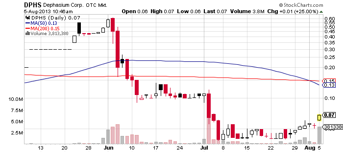 Dephasium Corp. (DPHS) – DPHS has been building a modest momentum as of late. Having been consolidating for about a month now, the stock started surging two weeks ago and eventually broke out through the resistance on Tuesday last week.