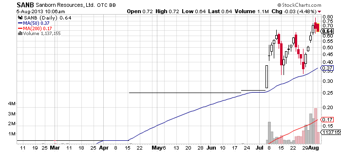 Sanborn Resources, Ltd. (SANB) – SANB is becoming more and more speculative after making a blast last week without any fundamental support at hand. Over the course of the week SANB stock managed to surge form $0.35 to $0.75 per share without the help of any corporate update or filing.