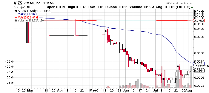 VizStar, Inc. (VIZS) – VIZS is another penny stock company which has been heavily promoted since the last closing bell. This campaign has involved six penny stock promoters, among which are Hot Stock Ace Publisher, Psycho Penny Stocks, Breaking Bulls and others.