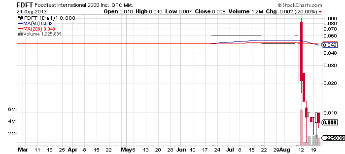 Foodfest International 2000, Inc. (FDFT) – The next heavily promoted stock for today is FDFT. This stock ticker, however, most likely still haunts penny stock traders with nightmares as it has completely wiped out the investments of those traders who betted on the stock when it was first promoted on Monday last week.