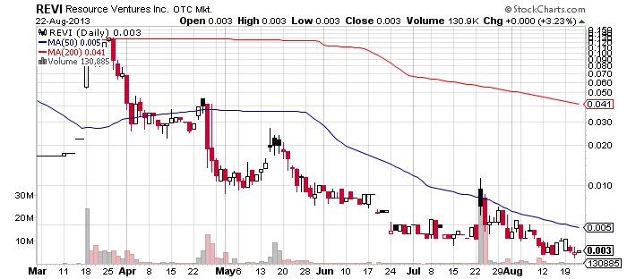 It is interesting to note, that REVI was previously promoted on Aug 8. However, REVI was not a success for its promoters as on the day of the recommendation the stock closed 17% lower at $0.004 per share on a higher than average volume of 2.7 million.