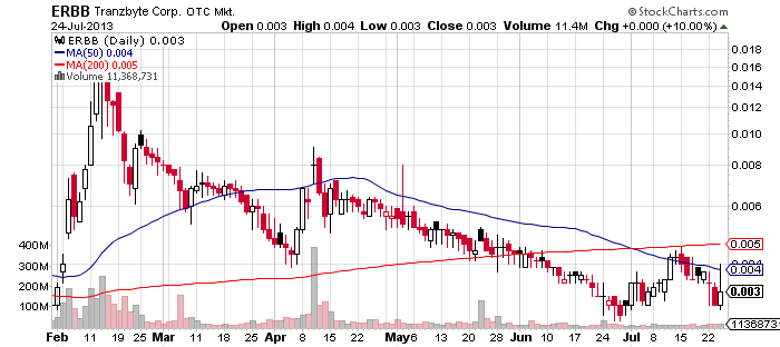 Tranzbyte Corp (ERBB) – The biggest promotion for today in terms of both compensation and number of involved promoters is dedicated to ERBB. The campaign has a serious back-up which is provided by three popular third parties called the Stock Mister, Micro-Cap Consultants and Equity Group LLC. They have provided a cumulative compensation of $75,000 which has been distributed among various promoting groups of websites.