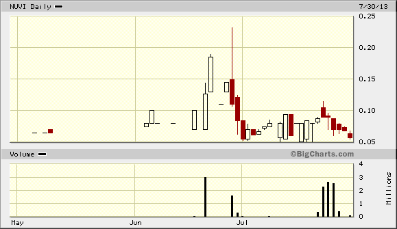 Online databases also show that a total of $32,500 had been invested in the advertising effort on NUVI. Perhaps, penny stock traders remember that NUVI was promoted last week on July 23. On that day, the stock surged 2% to $0.09 after hitting an intraday high at $0.115 per share on a ten times higher than average volume of 2.3 million.