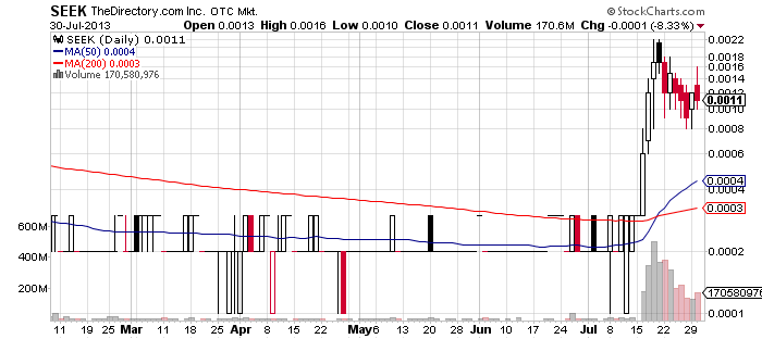 TheDirectory.com, Inc. (SEEK) – SEEK has received a second promotional backup this week, despite the fiasco of yesterday’s campaign. SEEK had the highest paid promotion yesterday but apart from attracting more trading interest than usual, the campaign didn’t manage to sustain an increase in SEEK share value.