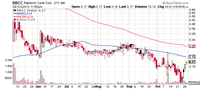 Rainbow Coral Corp. (RBCC) – Online databases have also registered a promotional campaign on RBCC. Although the promotion on the company is being led by only one promoter, called OTC Stock Pick Newsletter, the campaign is worth noticing, as it is one of the most expensive ones for today.