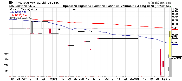 Nouveau Holdings, Ltd. (NHLI) – A last minute promotion has launched NHLI stock into the skies in the first trading hour of today’s session. The campaign was started just at the opening bell today and so far has managed to produce a 140% jump in NHLI share price on a higher than average volume of 3 million.