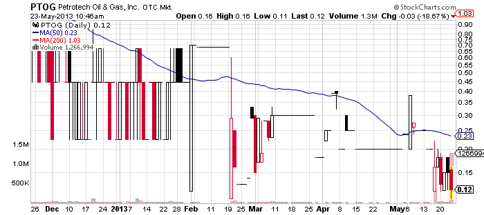 PTOG has a market cap of only $5 million and in general companies with low market cap usually do better at promotions. However, this not a fresh promotion of the company as it was already pumped on May 16th. Then PTGO achieved a trading volume almost twenty times higher than the average while its share price closed 20% lower than the previous close.