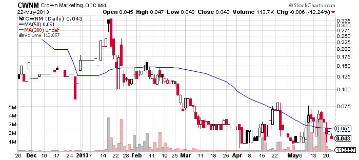Crown Marketing (CWNM) – This company is the highest paid promotion for today. CWNM is featured as a pick in a newsletter from Research Driven Investor who expects “an easy 15% potential run” of the stock.
