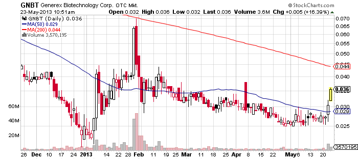Generex Biotechnology Corp. (GNBT) – GNBT, which is a popular bio tech penny stock company, announced yesterday that it was going to make three presentations about the AE37 breast cancer vaccine at the annual meeting of the American Society of Clinical Oncology to be held from May 31 through June 4, 2013.
