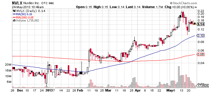 - NVLX has been in an uptrend since February and has hit a 52-week high at $0.22 in mid-May.
