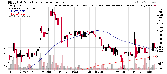 In the following months, however, KBLB retracted down to its pre-promotional levels. On the last trading session KBLB declined 6% to $0.08 per share on above average volume of 1.5 million. Another important thing worth noticing is that over the last five trading sessions there has been a gradual increase in the trading interest towards KBLB which happened without any significant recent announcements about the company.