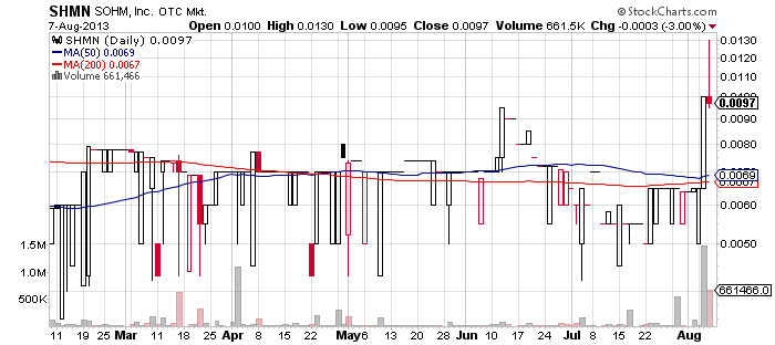 SOHM, Inc. (SHMN) – SHMN is another heavily promoted company ready to assualt today’s trading session. The campaign was initiated as soon as the last closing bell was rung, by numerous penny stock promoters, among which Psycho Penny Stocks, Breaking Bulls, First Penny Picks and many others.