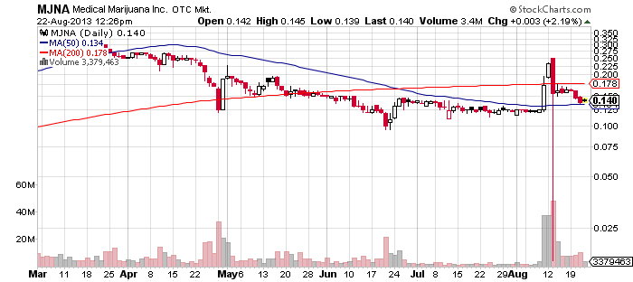 Medical Marijuana, Inc. (MJNA) – Yesterday, MJNA struggled under a moderate selling pressure which ended up with the stock losing 6% of its value at $0.14 per share on a higher than average volume of 10 million.