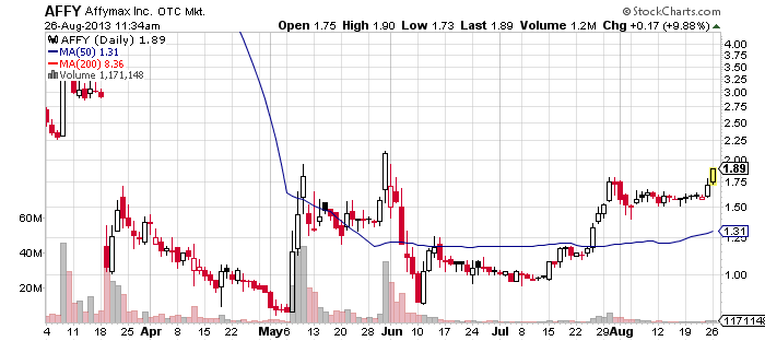 AFFY has been consolidating in a price channel between 1.50 and 1.75 since the beginning of August. During this month, the company provided some fundamental support to its stock when, in the middle of the month, it announced a deal with The Brenner Group Inc. (TBG).