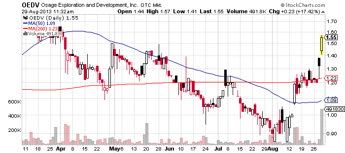 Osage Exploration and Development, Inc. (OEDV) – OEDV is another heavily traded penny stock on the OTC Markets today. What is notable about OEDV is that the value of its shares increased sharply in the last two weeks.