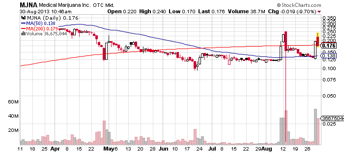 Medical Marijuana, Inc. (MJNA) – Today the OTC Markets have registered significant moves in the medical marijuana sector, with MJNA being the top traded penny stock for today. One hour after the start of the trading session MJNA has already generated a trade value of $7.4 million, while traders have registered more than 3150 transactions with MJNA stock.