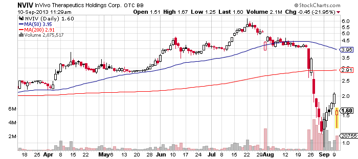 Last week, however, the stock rallied to $1.79 per share and yesterday NVIV rose another 15% to $2.05 per share. Nevertheless, today NVIV poured cold water on its shareholders’enthusiasm, after starting with a huge gap down at $1.51 and shortly dipping to an intraday low at $1.25 per share.