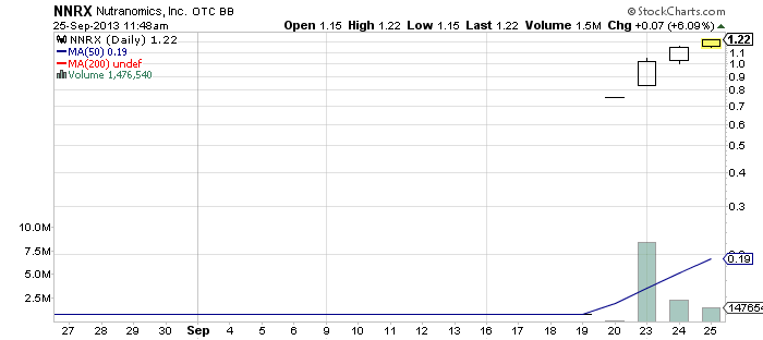 Nutranomics, Inc. (NNRX) – NNRX has been flying up since the change of its stock symbol, which marked the recent reverse acquisition by Health Education. The stock has also been one of the top market movers on the OTCQB markets in the last couple of days.